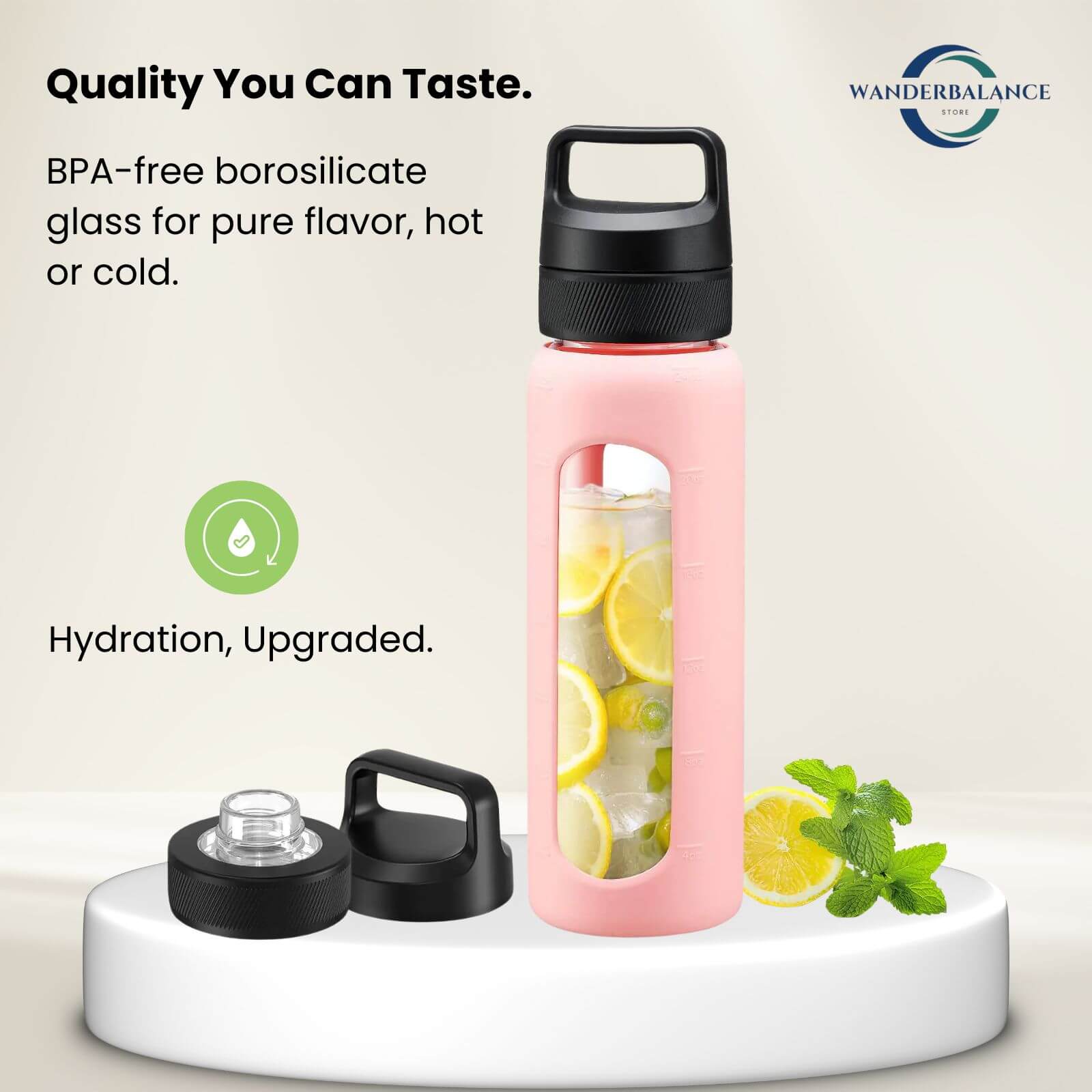 Crafted from high-quality borosilicate glass, this bottle is non-toxic, BPA-free, and resistant to thermal shock – safe for both hot and cold beverages. Its crystal-clear design also makes it easy to monitor your intake and looks great on the go.